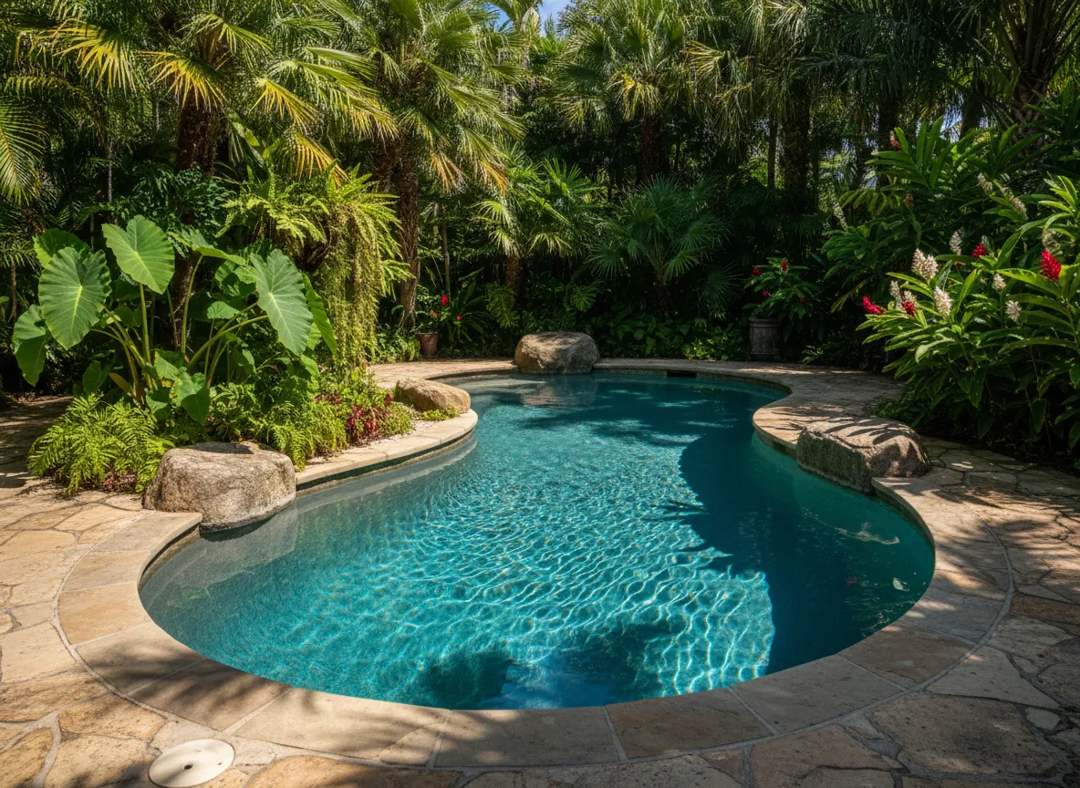 Organic freeform pool that blends into existing landscaping.